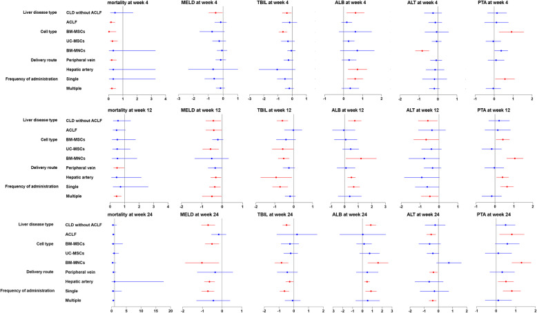 我們進(jìn)行了亞組分析,以探討干細胞治療對第4、12和24周死亡率、MELD評分以及TBIL、ALB、ALT和PTA 水平的影響是否受到不同疾病人群、細胞類(lèi)型、遞送途徑、和給藥頻率(圖10)。