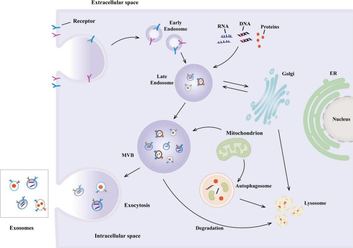 圖1:外泌體的生物合成。外泌體的生物合成始于細胞膜內吞過(guò)程中早期內體的形成,隨后成熟為多泡體 (MVB),并通過(guò)膜內陷形成腔內囊泡 (ILV)。MVB與質(zhì)膜融合后,ILV被釋放為外泌體。