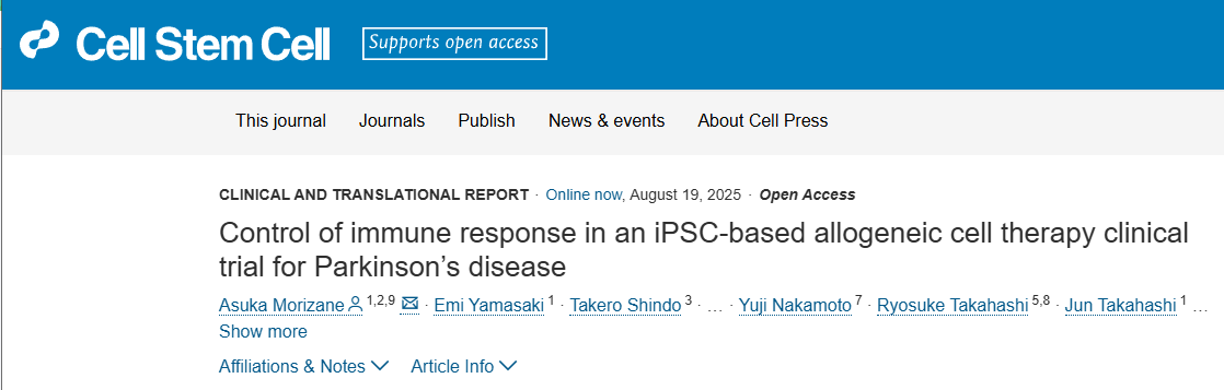 近日,日本京都大學(xué)iPS細胞研究與應用中心臨床應用系開(kāi)展了首個(gè)針對帕金森病、使用同種異體iPSCs的人體臨床試驗(jRCT編號:jRCT2090220384)。該項研究發(fā)表在《Cell Stem Cell》上[1]。