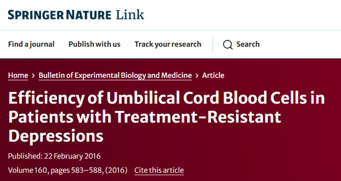 2016年,Smulevich等人進(jìn)行了一項值得注意的研究,他們研究了臍帶血細胞對難治性抑郁癥女性的治療潛力。參與者每周注射2.5億個(gè)濃縮臍帶血細胞,每四周一次。對照組接受安慰劑注射。雖然兩組的抑郁癥狀和低情境化癥狀均有所減輕,但治療組在難治性和抑郁嚴重程度方面顯示出延遲但更明顯的改善。此外,在干細胞治療組中還觀(guān)察到長(cháng)期認知改善。