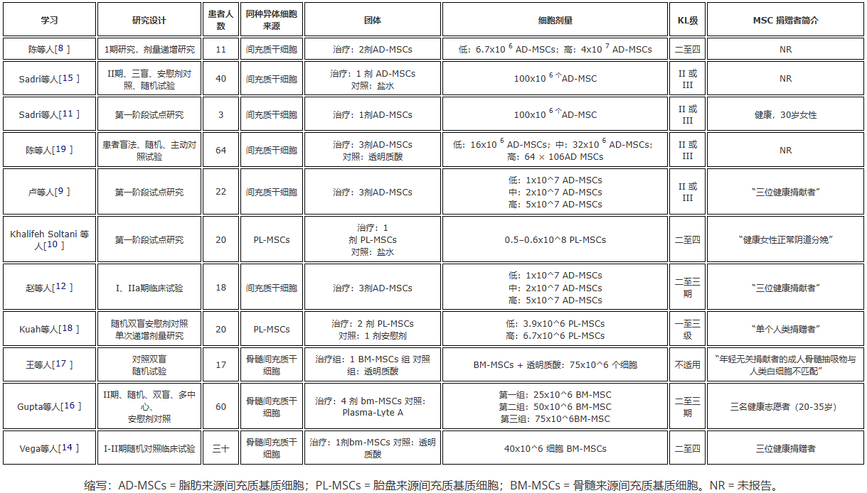 以下是基于研究中使用的同種異體細胞來(lái)源治療骨關(guān)節炎的總結。