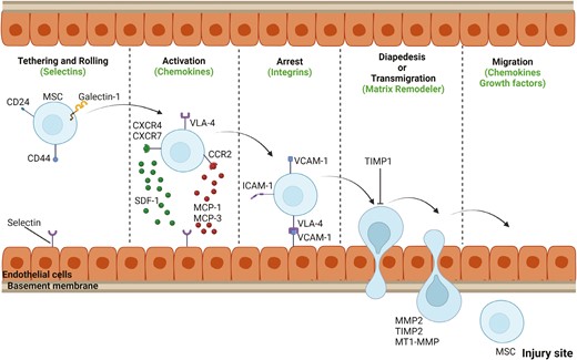 間充質(zhì)干細胞的系統性歸巢包括五個(gè)不同的步驟,包括黏附和滾動(dòng)、激活、細胞停滯、滲出或跨內皮遷移以及遷移。