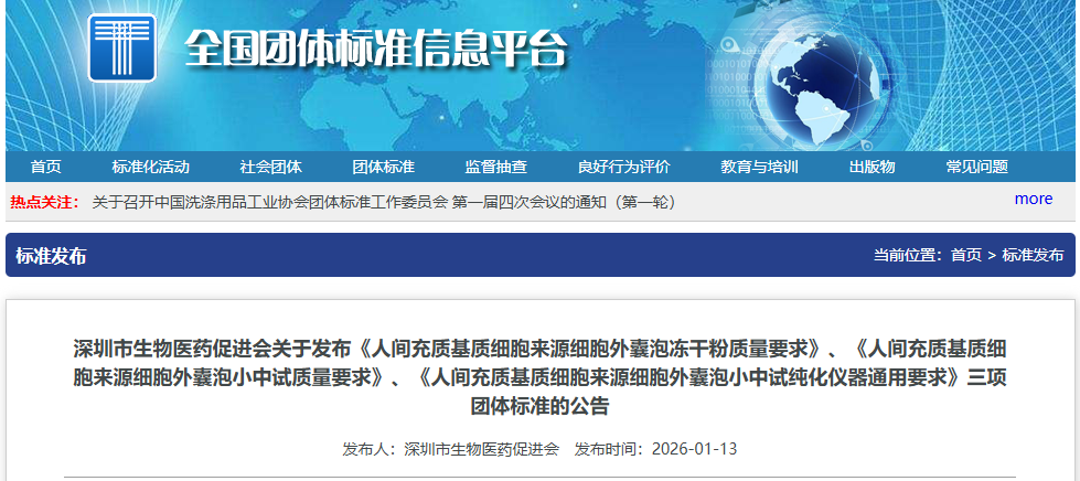 中國獸藥協(xié)會(huì )發(fā)布《貓用間充質(zhì)干細胞外泌體制備技術(shù)規范》等團體標準;深圳市生物醫藥促進(jìn)會(huì )連續發(fā)布《人間充質(zhì)基質(zhì)細胞來(lái)源細胞外囊泡凍干粉質(zhì)量要求》及《小中試純化儀器通用要求》等三項團體標準,對外泌體制備、純化及質(zhì)量控制各環(huán)節進(jìn)行嚴格規范。