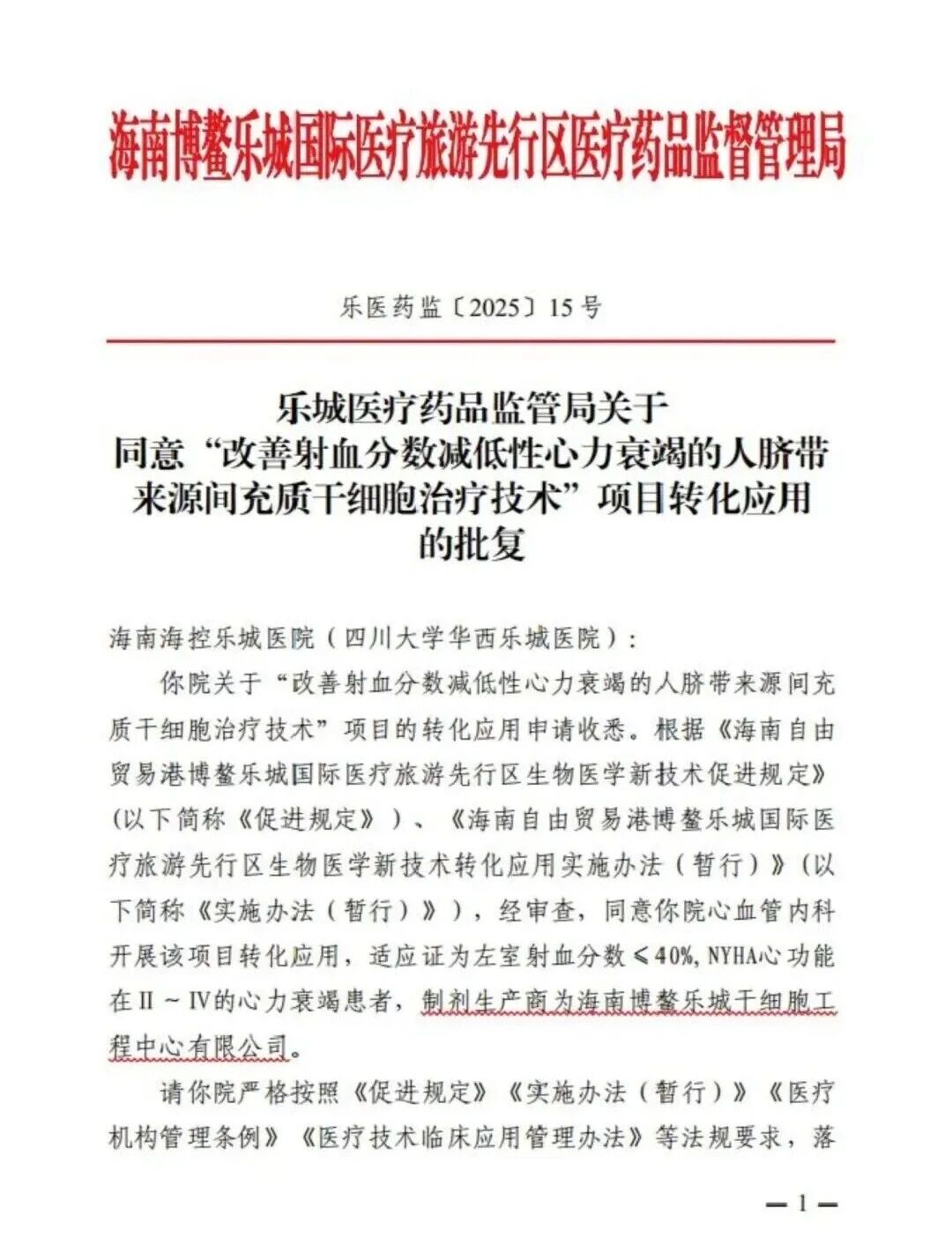 2025年2月13日,全國首個(gè)臍帶間充質(zhì)干細胞治療心力衰竭項目在海南博鰲樂(lè )城國際醫療旅游先行區落地,由四川大學(xué)華西樂(lè )城醫院心血管內科實(shí)施。該項目已通過(guò)樂(lè )城醫療藥品監管局批復(樂(lè )醫藥監〔2025〕15號),為傳統治療無(wú)效的重癥患者提供了合規、可行的新選擇。