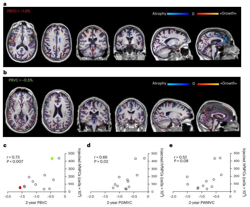 三個(gè)月后,每位患者又進(jìn)行了一次腰椎穿刺,研究團隊發(fā)現,他們的脊髓液中的神經(jīng)保護和抗炎分子都有所增加。每位患者在注射胚胎干細胞治療兩年后還接受了核磁共振掃描,那些注射最多胚胎干細胞的患者大腦灰質(zhì)損失最少。