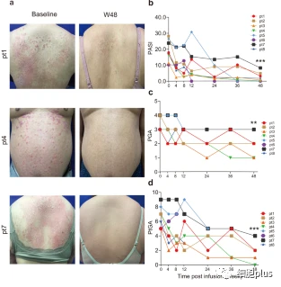 此外,與基線(xiàn)值相比,注射了冷凍保存的 UCMSCs 的銀屑病患者在銀屑病面積和嚴重程度指數 (PASI)、醫師整體評估 (PGA) 和患者整體評估 (PtGAs) 評分方面有顯著(zhù)改善。