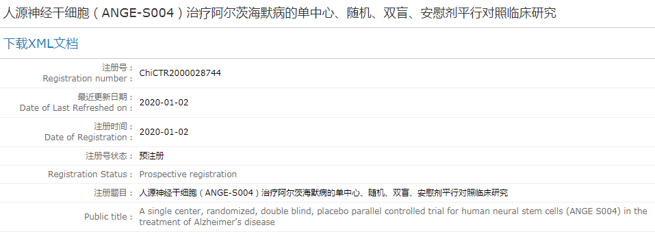 此外,在中國臨床試驗注冊中心也有干細胞治療老年癡呆的項目注冊,例如《人源神經(jīng)干細胞(ANGE-S004)治療阿爾茨海默病的單中心、隨機、雙盲、安慰劑平行對照臨床研究》(ChiCTR2000028744 )。同時(shí),國內還有《宮血干細胞治療輕度阿爾茨海默病的安全性和初步有效性的臨床研究》完成備案。