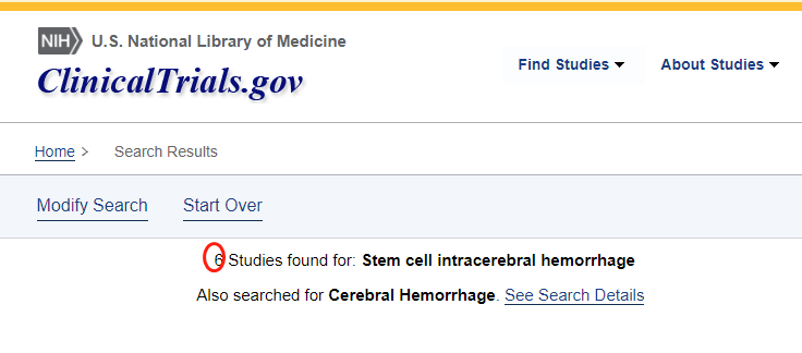 截至2022年12月5日,在美國國立衛生研究院的最大臨床試驗注冊庫clinicaltrials.gov網(wǎng)站上注冊的有關(guān)干細胞治療腦出血的臨床研究項目有6項。