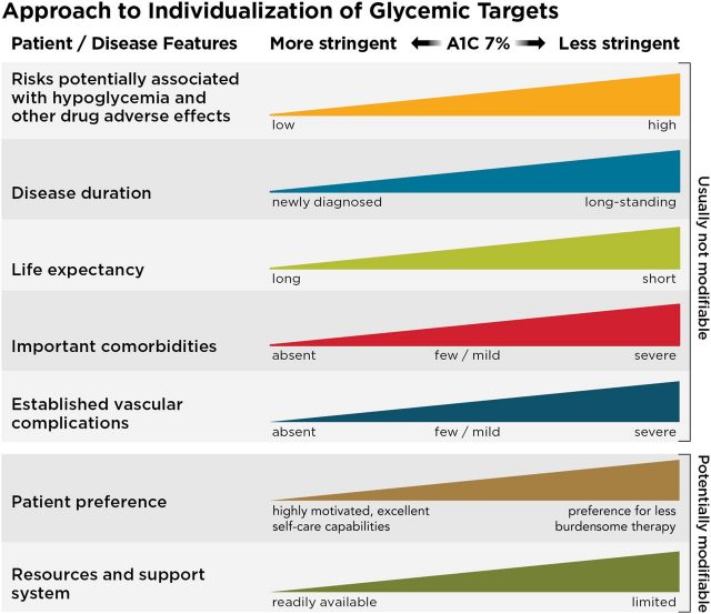 官方建議確實(shí)有一些回旋余地。美國糖尿病協(xié)會(huì )的這張圖表列出了一些其他因素,這些因素可能表明患者何時(shí)應該以較低(或較高)的血糖水平為目標: