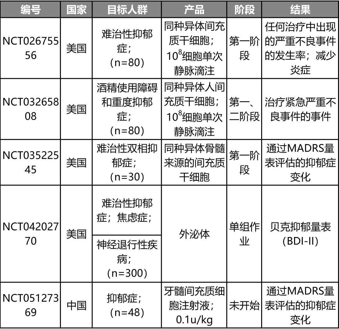 關(guān)于干細胞在臨床中的應用,我們在https://clinicaltrials.gov/找到了五項涉及使用間充質(zhì)干細胞及其外泌體治療抑郁癥患者的注冊臨床研究。目前,其中四項臨床研究(1期和2期)正在評估MSCs和外泌體給藥的安全性、有效性和耐受性。