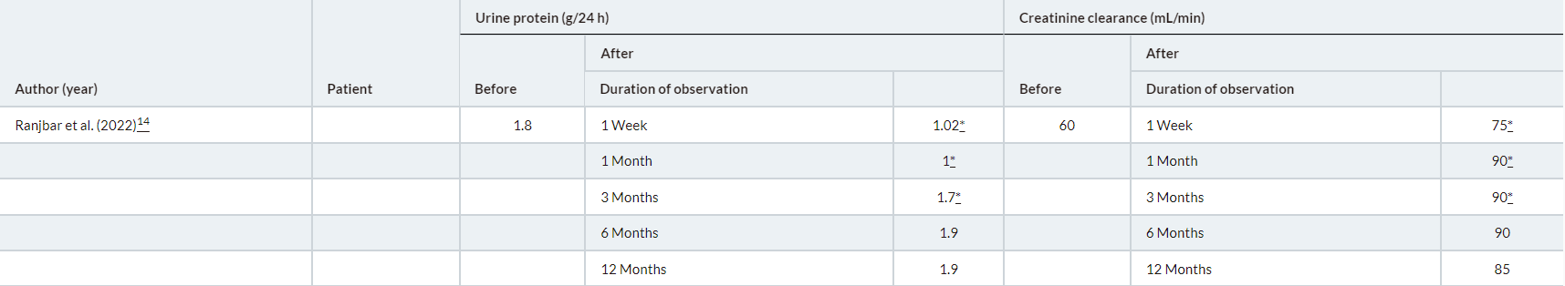 所有研究均表明,經(jīng)過(guò)1至12個(gè)月的不同隨訪(fǎng)期,蛋白尿有所改善。1個(gè)月隨訪(fǎng)后,各研究之間的腎功能改善情況不一致。