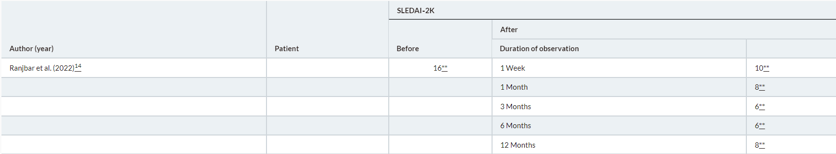 本系統評價(jià)中評價(jià)的所有研究還表明疾病活動(dòng)性有所改善,使用SLEDAI評分和血清抗dsDNA進(jìn)行評估。本系統評價(jià)中評價(jià)的所有研究均成功證明了SLEDAI評分的顯著(zhù)改善。