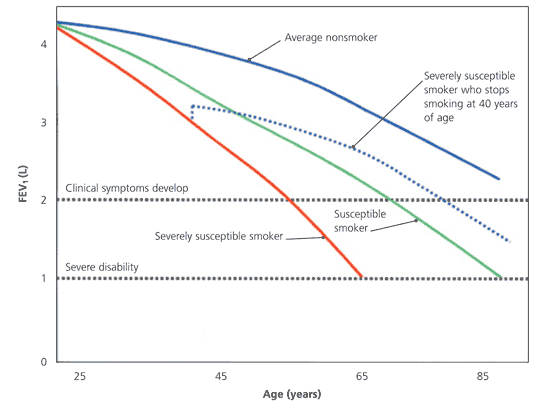 25歲以后,不吸煙的成年人的一秒用力呼氣量 (FEV1) 平均每年減少20至40毫升。在一些吸煙者中,FEV1降低了這個(gè)數量的兩到五倍,使他們特別容易患上慢性阻塞性肺病。戒煙可能會(huì )導致FEV1略有初始改善(第一年約為50mL)。更重要的是,戒煙可以使曾經(jīng)吸煙的人與從不吸煙的人一樣平均持續喪失肺功能。圖1說(shuō)明了肺功能在各種情況下的逐漸喪失。