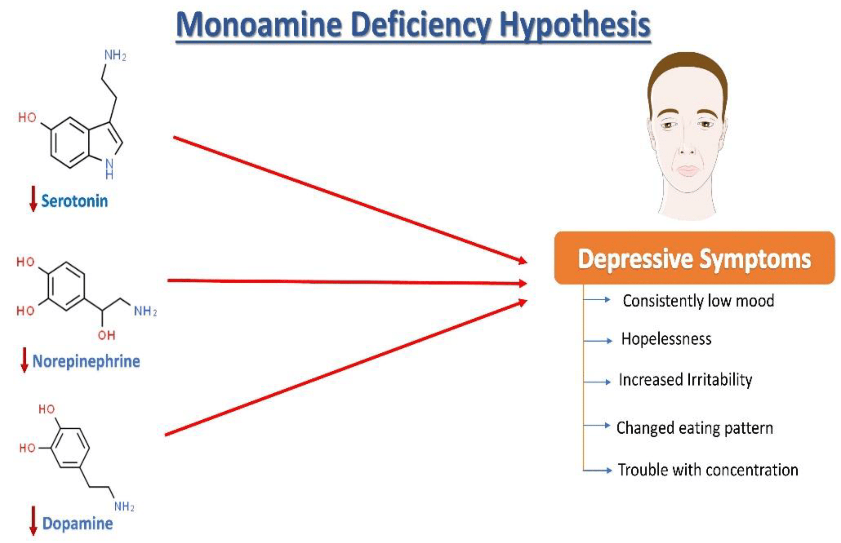 已觀(guān)察到血清素、去甲腎上腺素和多巴胺水平降低,并被認為是導致抑郁癥狀產(chǎn)生的主要因素之一。