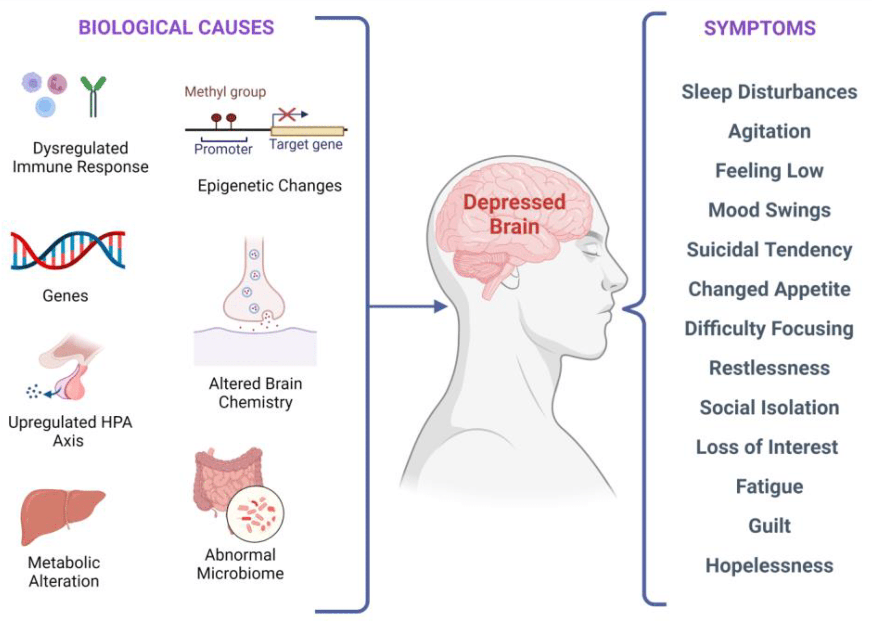 在分子、遺傳、表觀(guān)遺傳、細胞和系統水平上有多種生物學(xué)原因。這些原因會(huì )導致臨床抑郁癥,并且可能會(huì )出現多種癥狀,這些癥狀可能因人而異。