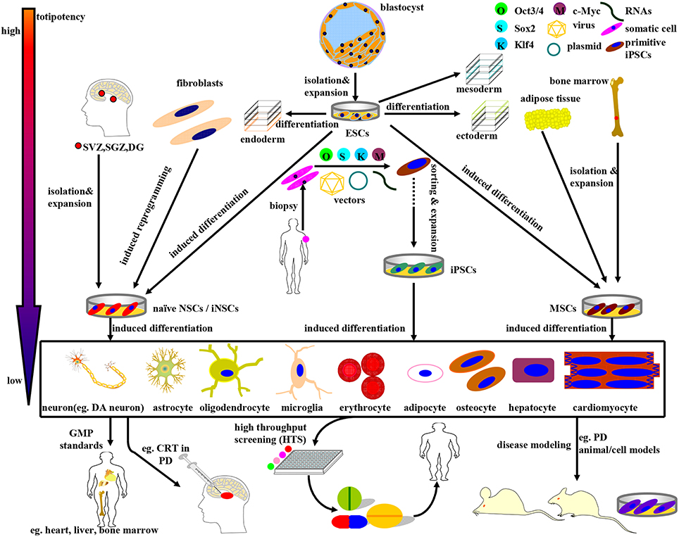 上述干細胞可分為ESCs、NSCs、MSCs和iPSCs四大類(lèi),伴隨著(zhù)逐漸下降的全能性。