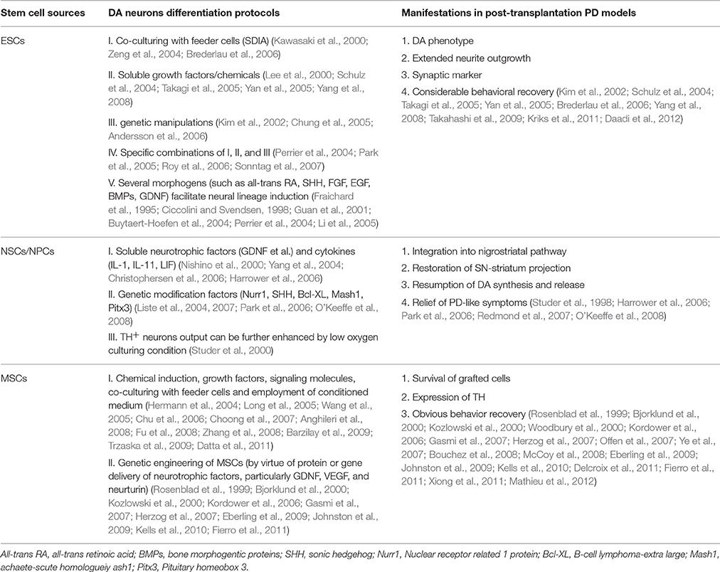 至于NSC,與ESC相比的一個(gè)潛在優(yōu)勢是,除了神經(jīng)譜系分化受限外,它們在移植后不易形成腫瘤和引起免疫排斥反應。然而,神經(jīng)干細胞顯示出一些缺點(diǎn),如有限的分化能力和來(lái)源、揮之不去的倫理問(wèn)題、帕金森癥狀的部分緩解。