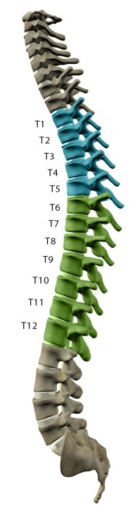 胸椎位于背部的上部和中部。胸椎有12塊椎骨,編號為T(mén)-1至T-12。每個(gè)數字對應于脊髓該部分的神經(jīng):