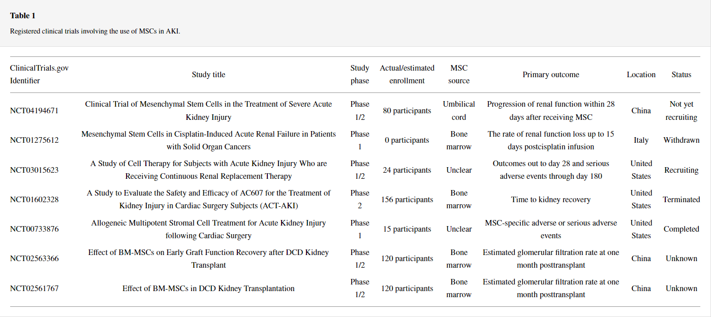 鑒于不同類(lèi)型的臨床前AKI模型的有希望的結果,已經(jīng)進(jìn)行了幾項臨床試驗來(lái)評估基于MSC的干預措施對 AKI患者的安全性和有效性。