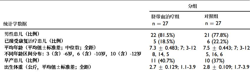 這項臨床研究入組了54名患兒,平均分為兩組。治療組的27人在大約一個(gè)月內接受了4次臍帶間充質(zhì)干細胞輸注(單次細胞量為5×10^7,每次間隔7天),而對照組的27人輸注的是0.9%生理鹽水。兩組受試者均同時(shí)接受基礎康復治療。