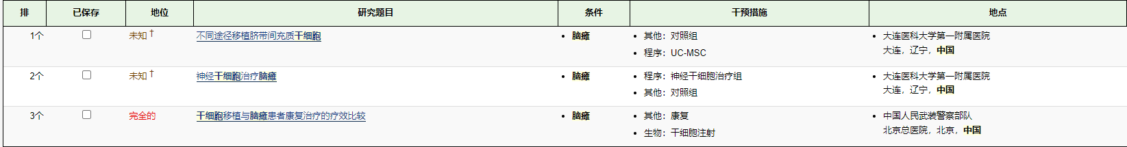 | 1個(gè) | | 未知 ? | 骨髓干細胞移植治療腦癱 | 腦癱 | 生物:干細胞療法 | |