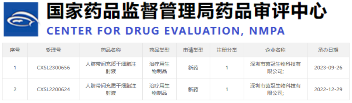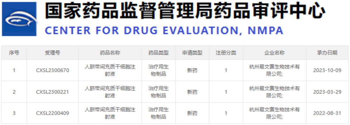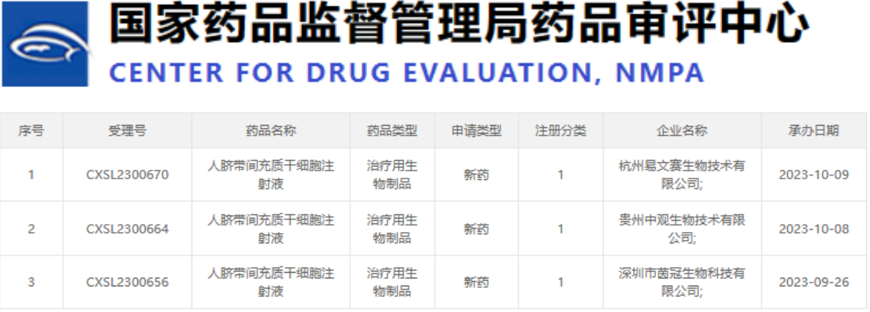 最近,國家藥品監督管理局藥品審評中心又公示了三家公司的干細胞新藥申請,這三家公司分別是深圳市茵冠生物科技有限公司(CXSL2300656)、貴州中觀(guān)生物技術(shù)有限公司(CXSL2300664)和杭州易文賽生物技術(shù)有限公司(CXSL2300670)。值得一提的是,這次受理新藥名稱(chēng)均為“人臍帶間充質(zhì)干細胞注射液”。