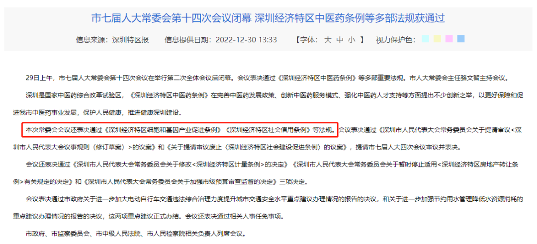 2022年12月29日上午,深圳市第七屆人大常委會(huì )第十四次會(huì )議在舉行第二次全體會(huì )議后閉幕。會(huì )議表決通過(guò)多部重要法規,其中,《深圳經(jīng)濟特區細胞和基因產(chǎn)業(yè)促進(jìn)條例》正式通過(guò)表決。