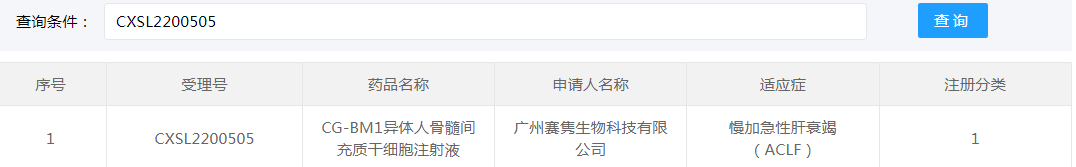 廣州賽雋生物科技有限公司的“CG-BM1異體人骨髓間充質(zhì)干細胞注射液”(受理號:CXSL2200505)獲得新藥臨床試驗默示許可,適應證為:慢加急性肝衰竭(ACLF)。這是該干細胞注射液的第二種適應證,此前已獲得默示許可用于注射給藥用于感染引起的中重度成人急性呼吸窘迫綜合征(ARDS)(受理號:CXSL2101334)的臨床試驗。